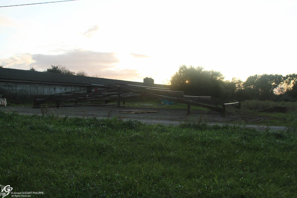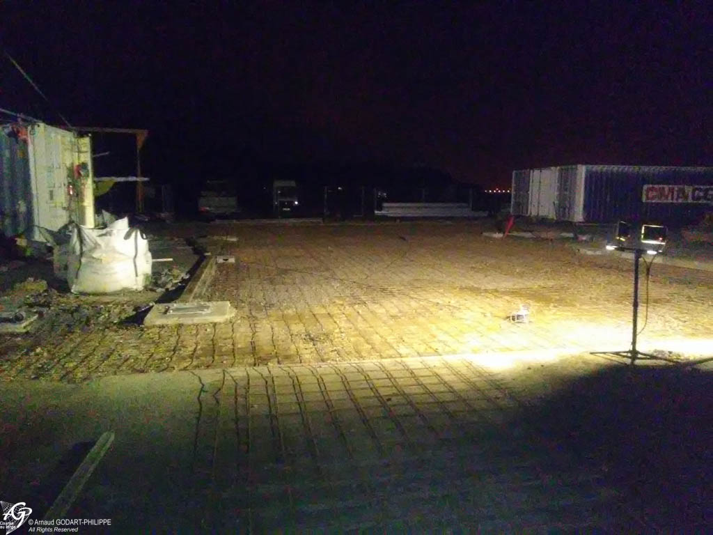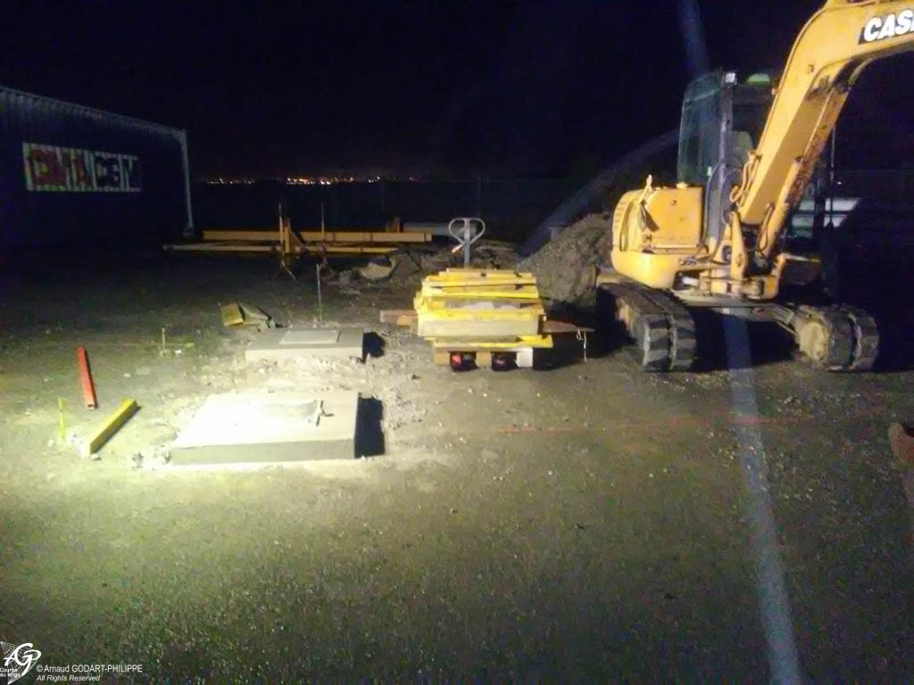 Les conteneurs prêts à être mis en place, nous avons débuté le terrassement de la zone avec la coulée de fondations du chantier et la pose de l'assainissement du bureau. Puis effectué le terrassement et le ferraillage de la dalle du chantier de 280m². La coulée de la dalle a été mise en oeuvre en 1 fois avec un réglage et une finition à l'hélicoptère après l'intégration des canalisations de drainage et de récupération des eaux industrielles du chantier et des réseaux sous terrains.