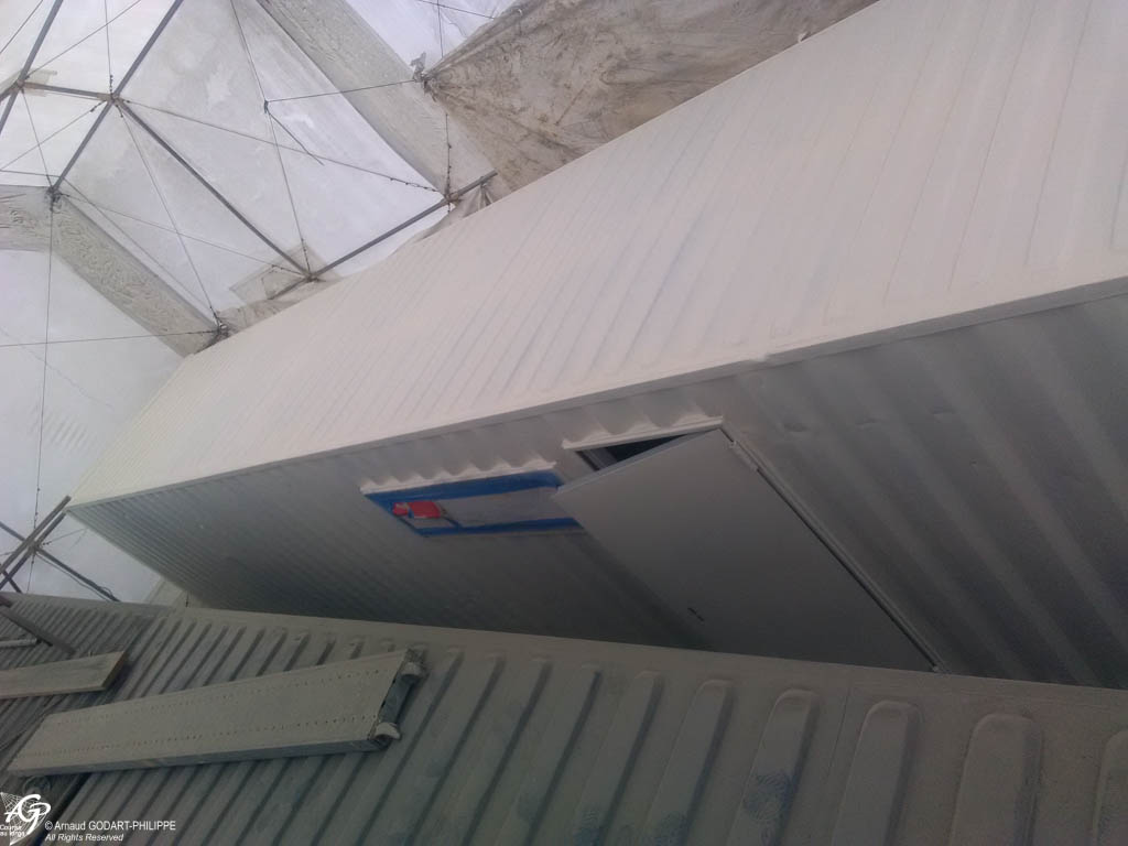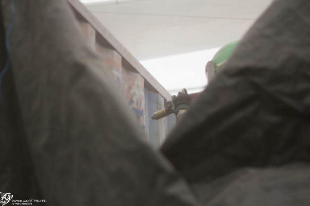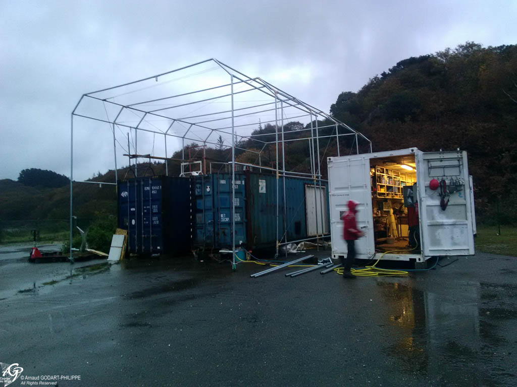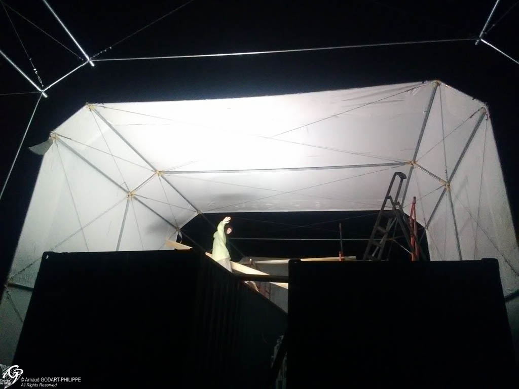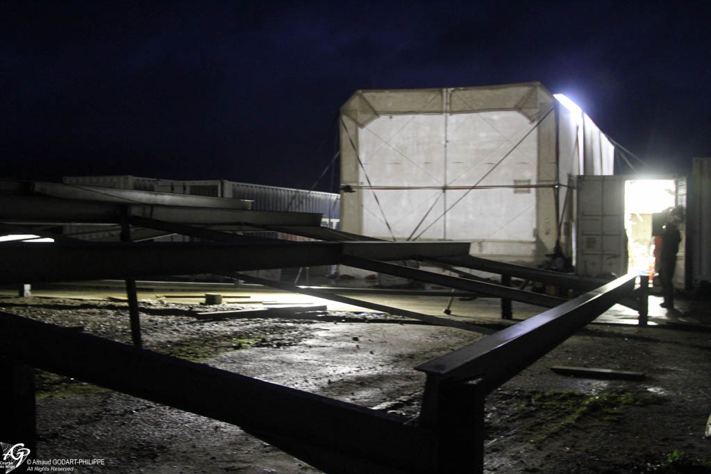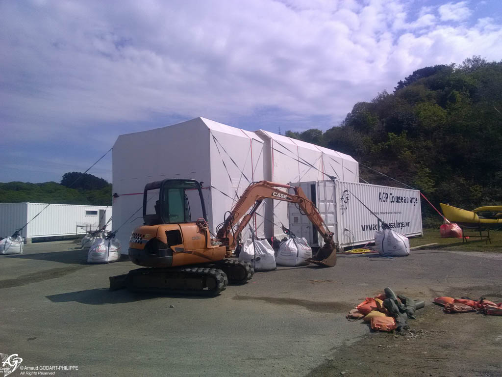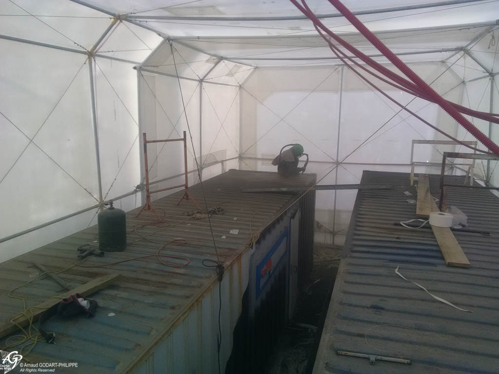En novembre nous avons assemblé sur site à Lanvéoc notre cabine de peinture télescopique de 6 m de haut, 7.50m de large et de 12 à 24 m de long. Cette cabine a permis de préparer les 7 conteneurs maritimes qui constituent l'ossature du chantier naval.