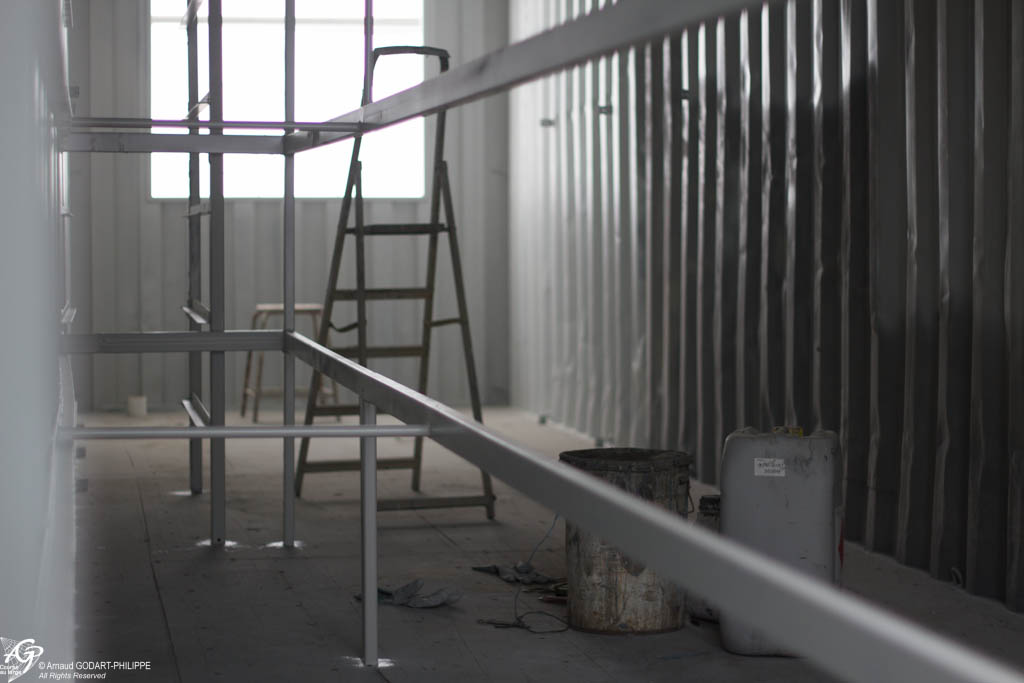 Le terre plein de stockage a été débarrassé des gravats de la construction pour préparer l'arrivée des bateaux en septembre 2021 et la cabine de peinture est modifiée pour sa fonction suivante : accueillir les bateau en chantier.
