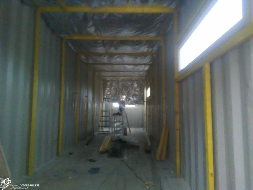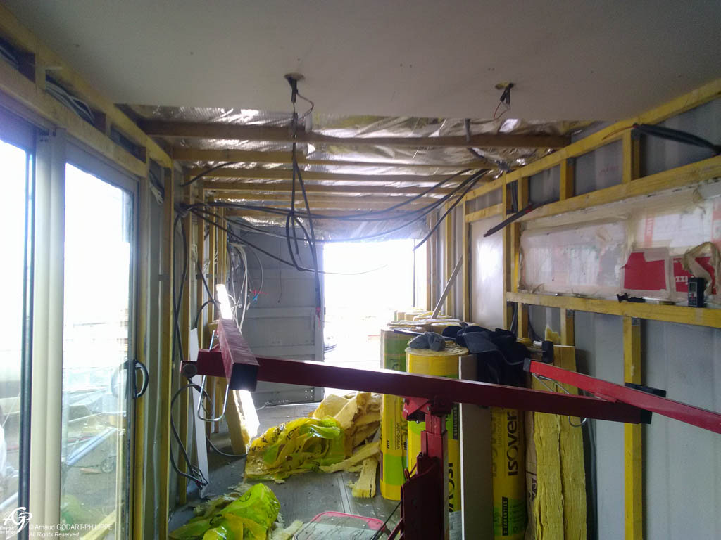 Ensuite, pour les conteneurs devant être isolés, nous avons installés une ossature bois intérieure sur des fixations métalliques soudées au moment de la préparation en métallerie, installé réseaux et isolation intérieurs puis appliqué les revêtements de finition.