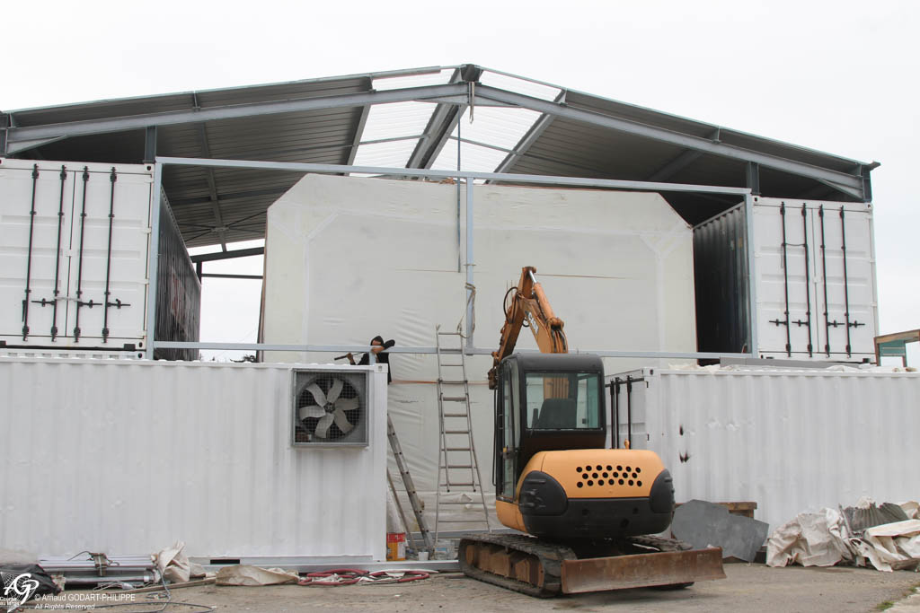 De mars à mai, le câblage des 7 conteneurs a été effectué, le plancher de la voilerie a été aménagé. Nous avons ensuite fabriqué l'ossature métallique des pignons du bâtiment et effectué un montage à blanc afin de vérifier les cotes avant galvanisation des éléments.